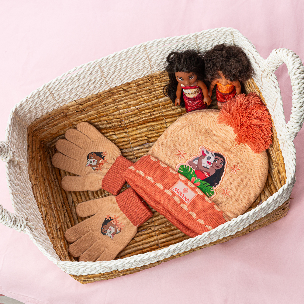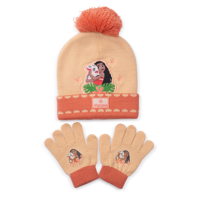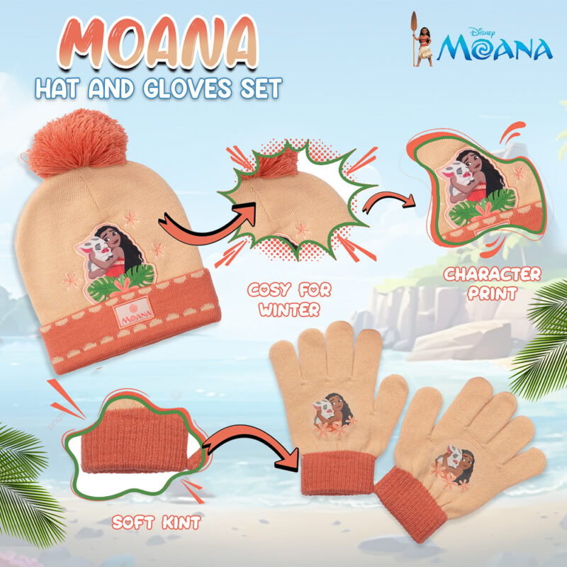 - DISNEY MOANA WINTER HAT & GLOVES SET : adorable Moana & Pua artwork with tropical details on a cosy bobble beanie and matching gloves — perfect for fans.