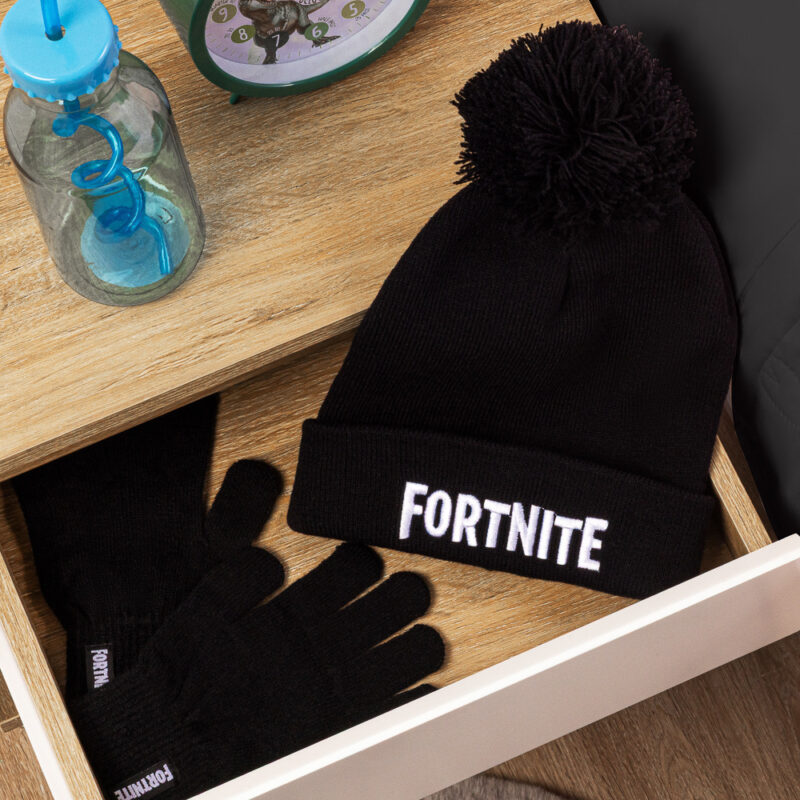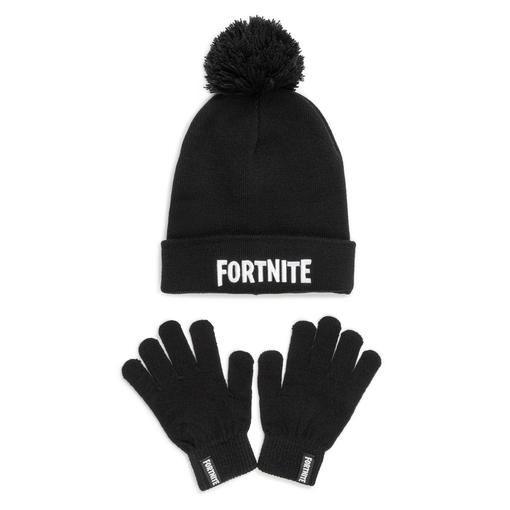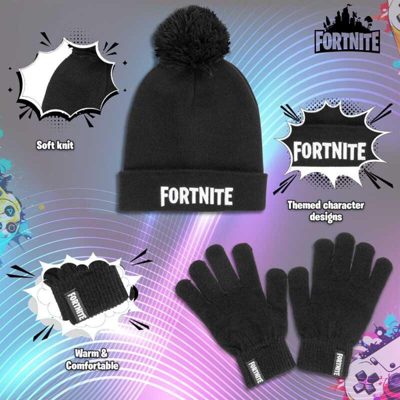 - WINTER SET CONTENTS: Official Fortnite branded winter set includes a cosy black beanie hat with pom-pom and matching gloves, perfect for cold weather
