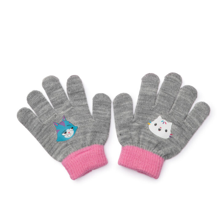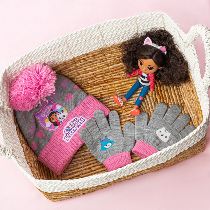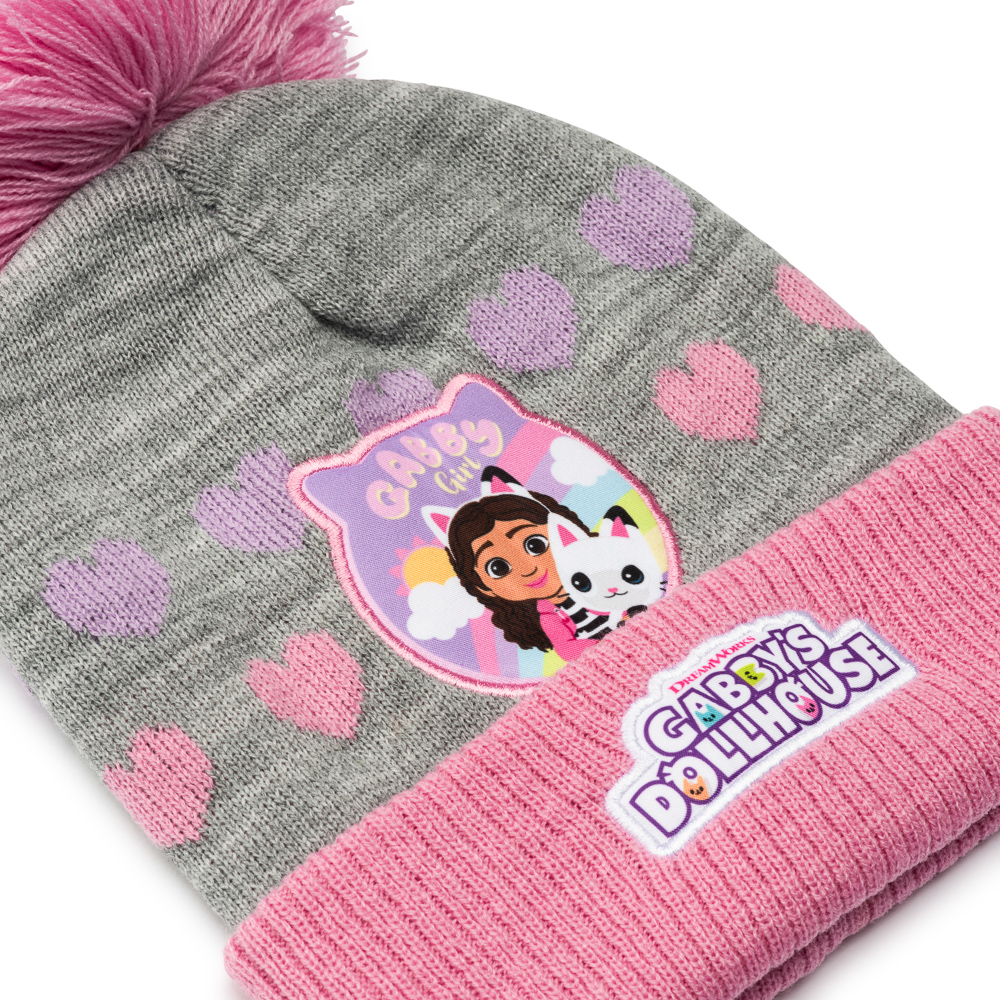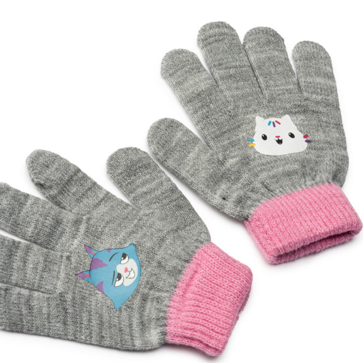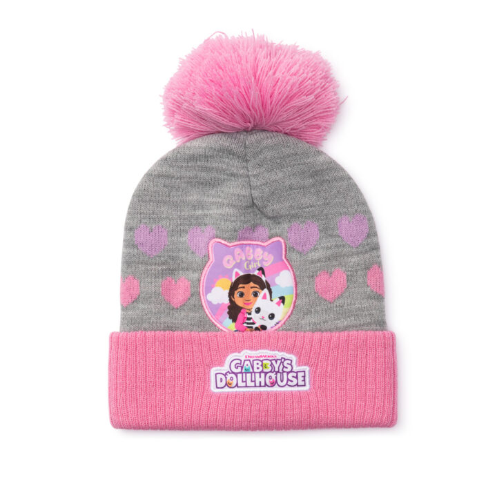 - Adorable Gabby’s Dollhouse design – Grey and pink girls beanie and gloves set featuring Gabby, Pandy Paws and Cakey Cat graphics with heart details and a fun pink pom-pom. Perfect for young fans of the hit series.