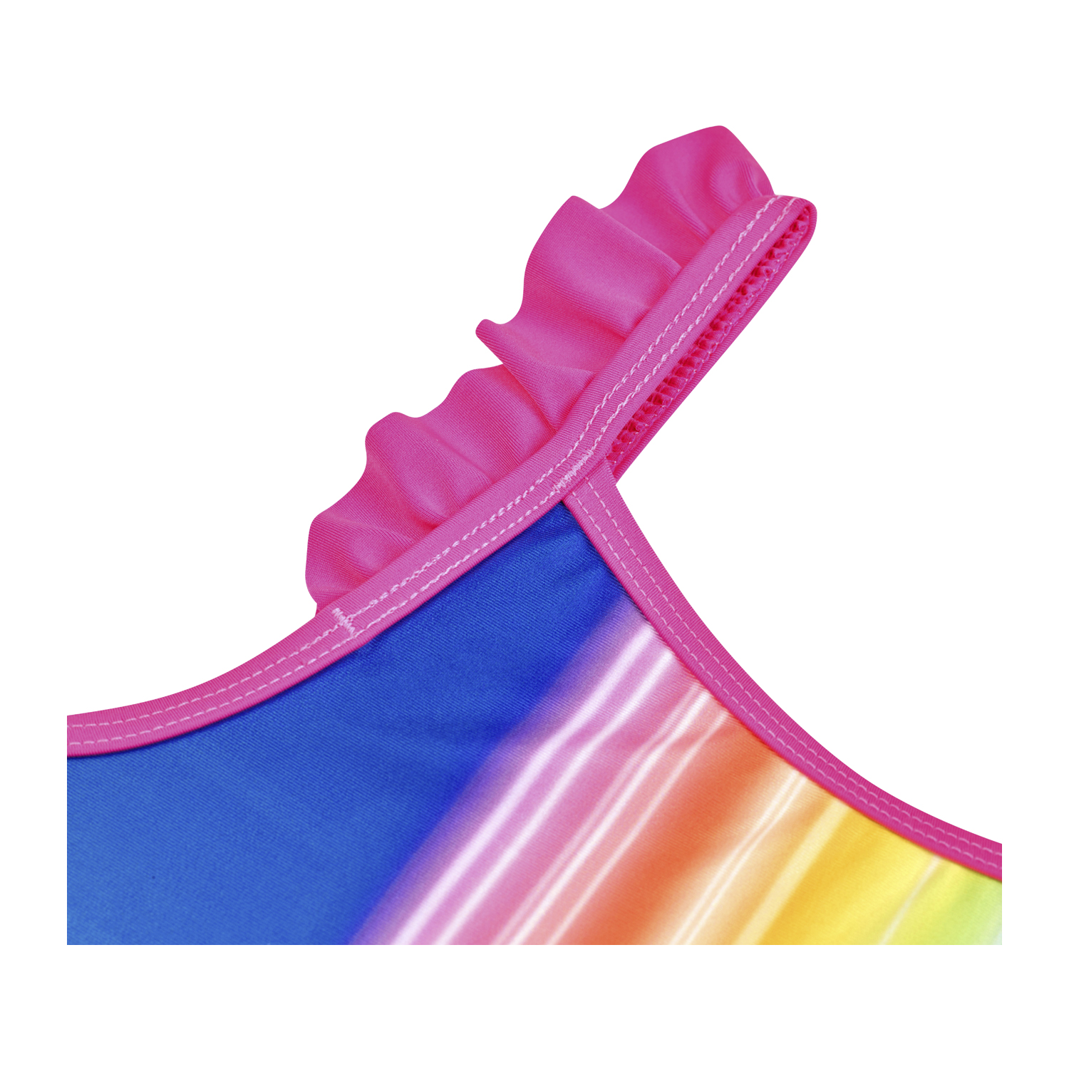 One piece swimming costume with fabulous rainbow stripes and a picture of the 5 rainbow dolls with the Rainbow High logo