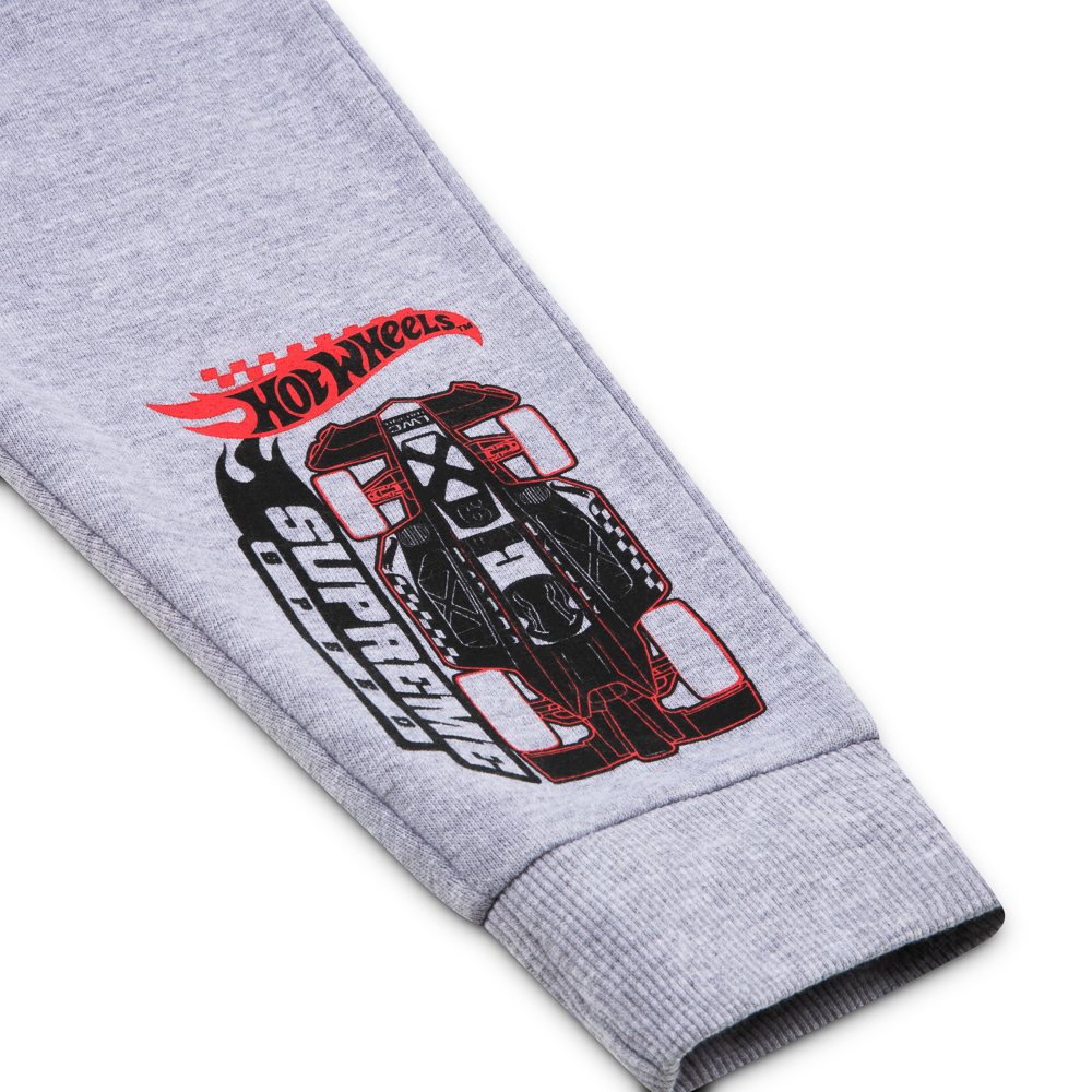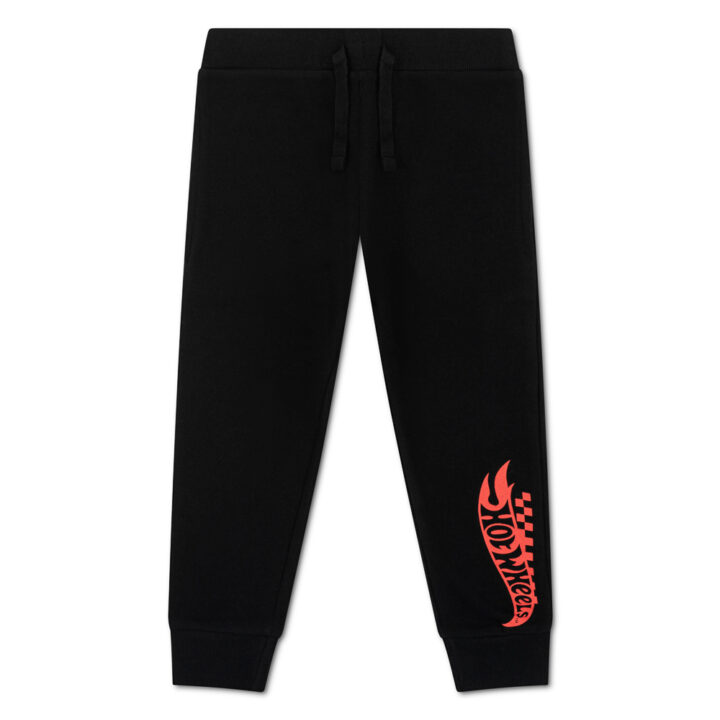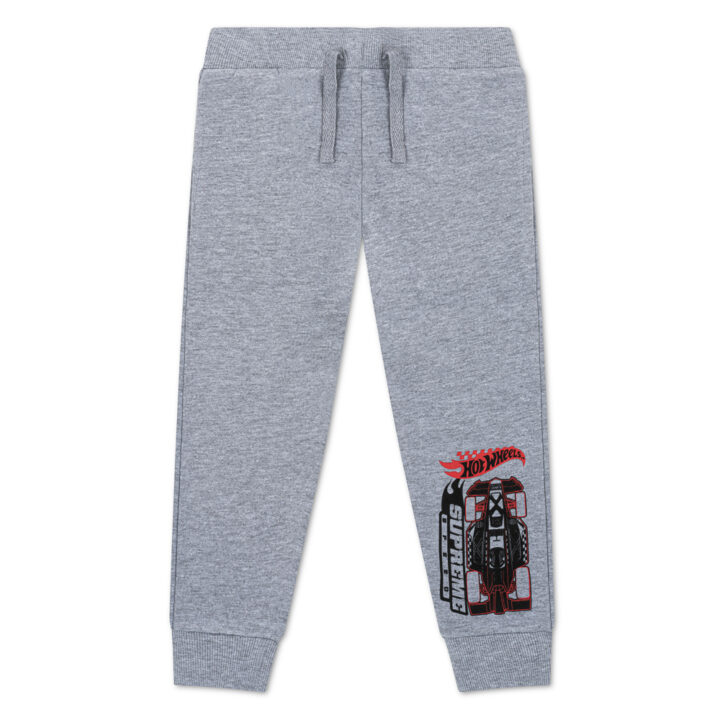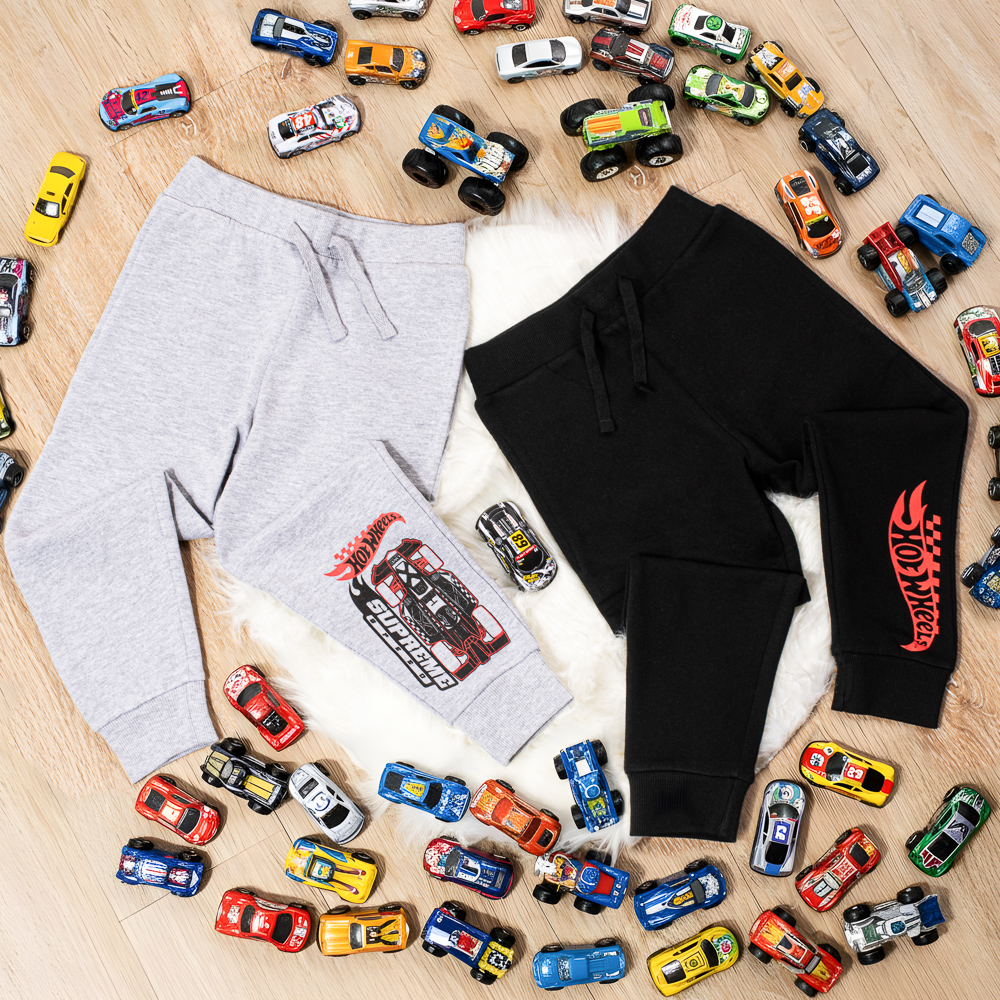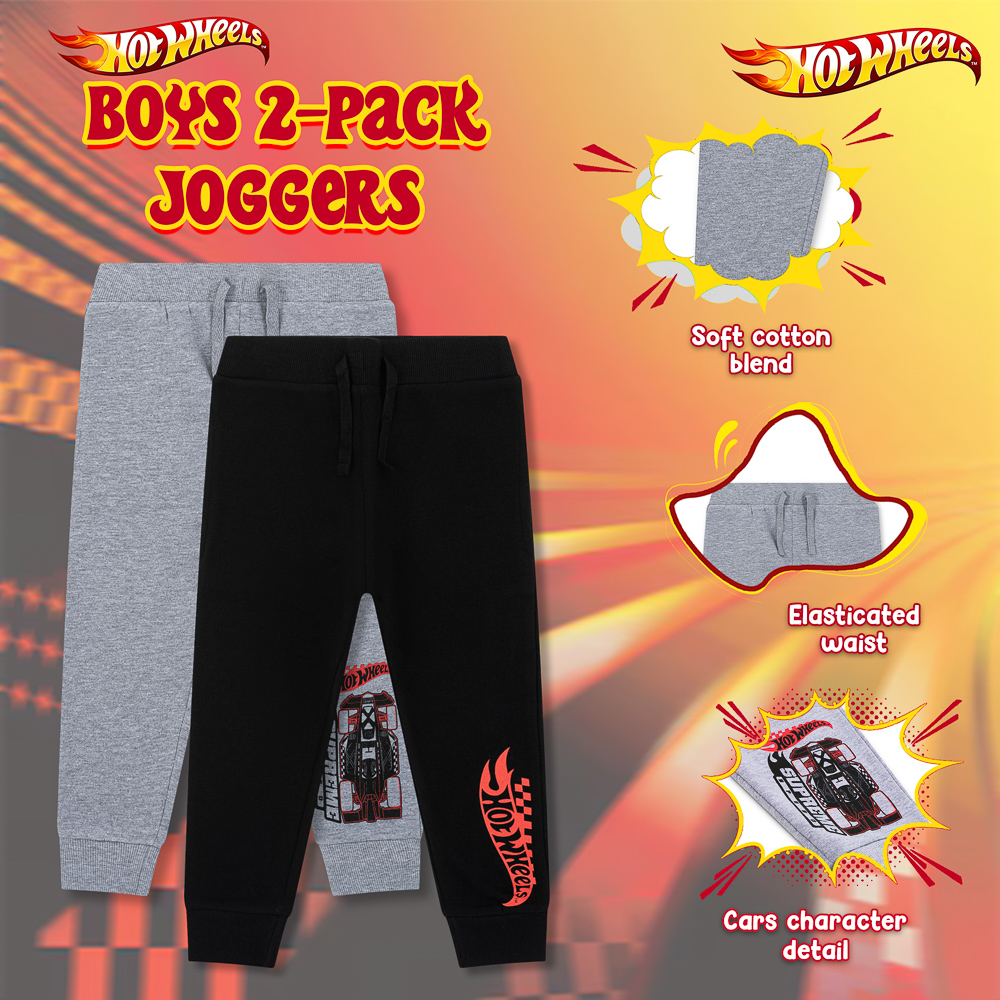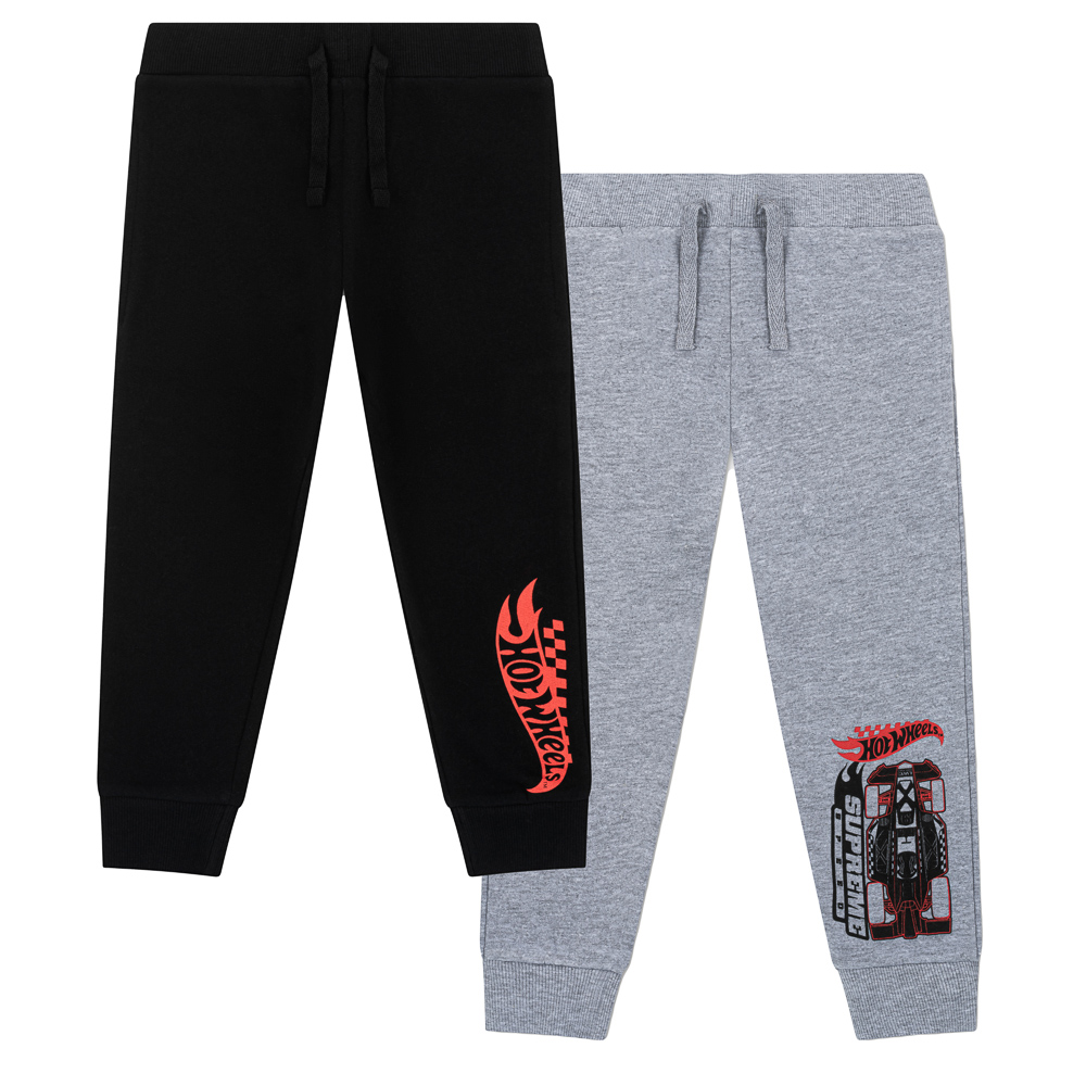 - Official Hot Wheels boys joggers 2-pack: value bundle with one black pair featuring the iconic flame logo and one grey marl pair with racing car artwork—great for fans, gifting and everyday wear.
