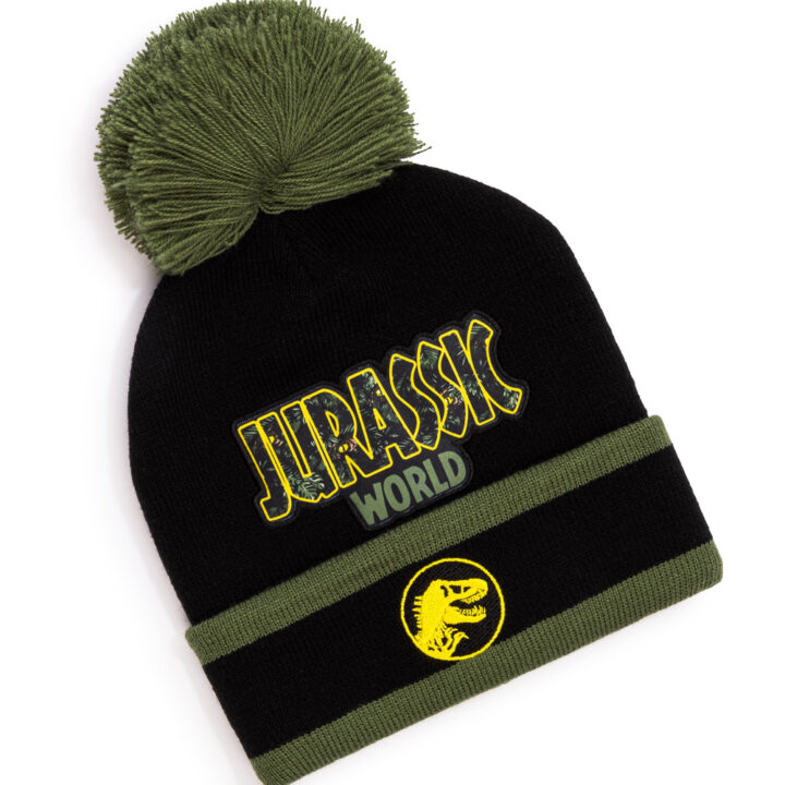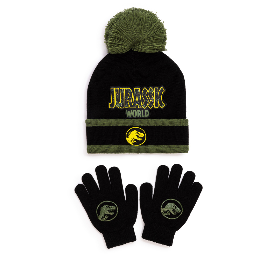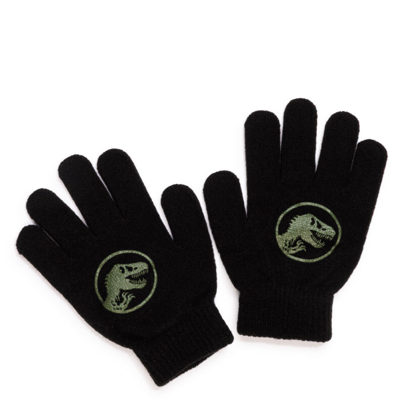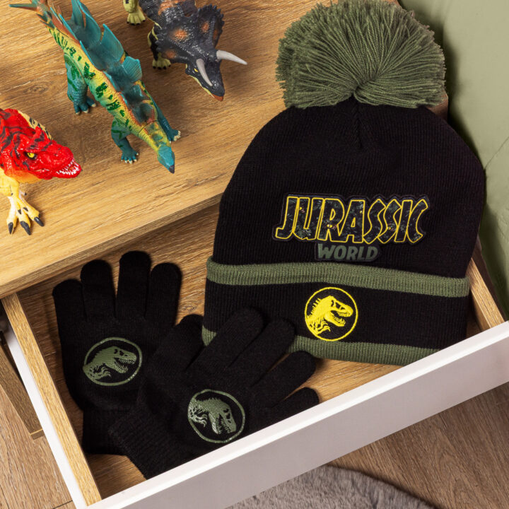 - JURASSIC WORLD HAT & GLOVES SET – Black & khaki boys’ winter set featuring the iconic Jurassic World branding with a bold T-Rex badge; the perfect cold-weather accessory for dinosaur lovers.